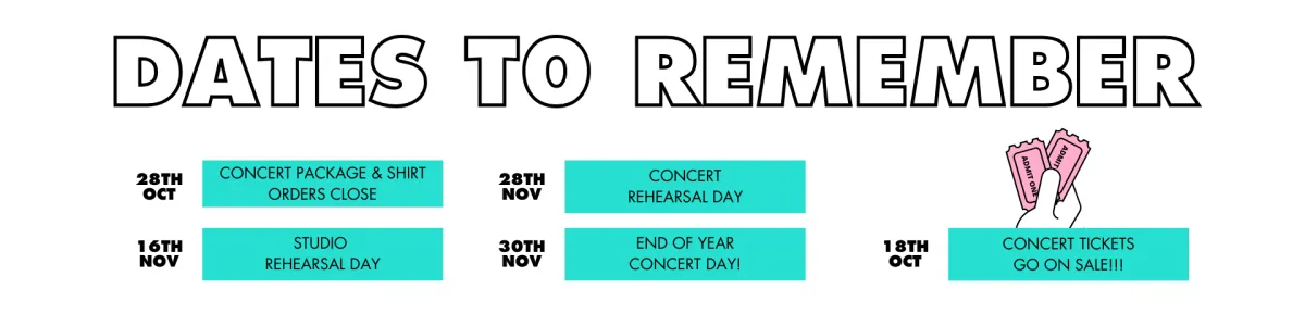 If there is any reason why your child will not be able to perform at the concert on the dates and times provided, please let us know so we can make amendments to the class routines involving them.